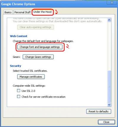 অনেক দিন ধরেই মহা বিরক্তের মধ্যে ছিলাম। বোকা লোকতো তাই বুঝতেছিলাম না কি করবো। বাংলা লেখা দেখলেই Ctrl চেপে ধরে মাউসের স্ক্রুল ঘুরিয়ে পেইজ বড় করে দেখতাম। গত কালকে ঢুকলাম ক্রোমের অপসনে দেখি কিছু মিলে কি না। ফন্ট একটা একটা করে পাল্টিয়ে দেখি কি হয়। না হলে আবার আগের ফন্ট সিলেক্ট করে দিবো। আগেই বলে নেই আমার পিসিতে সোলাইমানলিপি ফন্টা আছে। উপরে ডান পাসের কোনায় ক্রোম ক্লোজ করার ঠিক নিজে যেখানে মাউস নিলেই লেখা উঠে। Customize and Control Google Chrome ঐ খানে ক্লিক মেরে চলে গেলাম Option এ। এখন ৩টা ট্যাব আছে Under the Hood ট্যাব ক্লিক করলাম। এই ট্যাবের নিচের দিকে একটা অপসন আছে। ছবি দেই তাহলে বুঝবেন কি করছি।