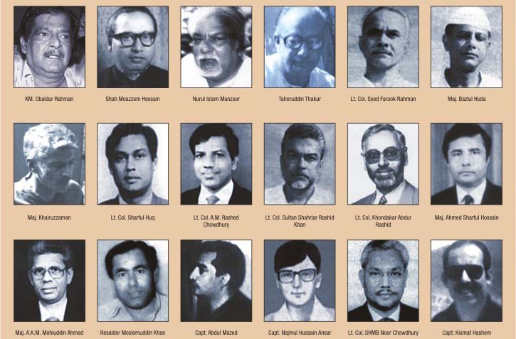 এই ছয় আসামি হলেন- অবসরপ্রাপ্ত লেফটেন্যান্ট কর্নেল খন্দকার আব্দুর রশিদ, রাশেদ চৌধুরী, নূর চৌধুরী, মেজর শরিফুল হক ডালিম, ক্যাপ্টেন আবদুল মাজেদ ও রিসালদার মোসলেহউদ্দীন।
