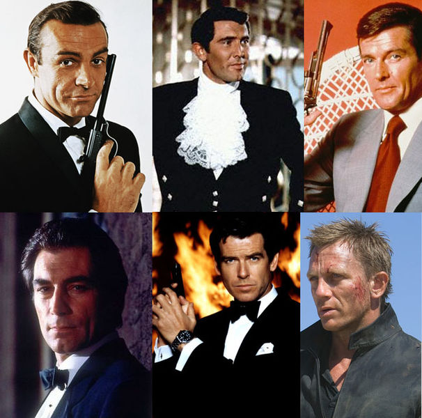 উপরে বাঁ থেকে ডানে- শন কনারি , জর্জ লেজেনবি , রজার মুর , টিমোথি ডাল্টন , পিয়ার্স ব্রসনান , ড্যানিয়েল ক্রেগ