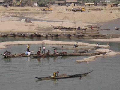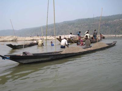 পিয়াং নদী থেকে পাথরের গুড়ি তোলায় ব্যস্ত শ্রমিকরা।