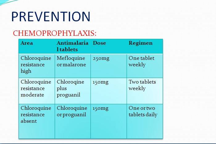 ম্যালেরিয়া প্রবণ এলাকায় যাওয়ার আগে ঔষধ খেতে থাকুন আসার পর পর্যন্ত। নিচে একটি চার্ট দেয়া হল , এতে ডোজ অনুসারে যে কোন একটি ঔষধ খান। ডা. মৌরি আপু দিসে স্লাইডটা