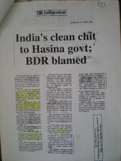এমন আরও খবর। আপনি ভাবতে পারেন সরকার কি করে ?২০১০ এর ১০ জানুয়ারি ছিলো প্রধানমন্ত্রীর ভারত সফর, এর আগের দিন ৯ জানুয়ারি চাঁপাইনবাবগঞ্জ এবং বেনাপোল সীমান্তে মনিরুল ইসলাম এবং হজরত আলী নামে দুজনকে হত্যা করে। আগে যেটা দেখা যেতো শুধু গুলি করে হত্যা, এবার পিটিয়েই হত্যা করেছে গরু ব্যবসায়ীকে। ১০ জানুয়ারি প্রধান মন্ত্রী ভারত গেলেন। ১২ তারিখ তিনিতখনও ভারতে সে অবস্থায়ও দৌলতপুর সীমান্তে ১ জনকে গুলি করে হত্যা করেছে ১ জনকে। ১৩ তারিখ প্রধানমন্ত্রী সফর শেষ করে বাংলাদেশে আসেন সেদিন সাতক্ষীরা সীমান্তে ১জন নিহত হয় বিএসএফ এর হাতে।