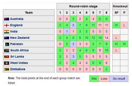 ✪ সেমি ফাইনালে সাউথ আফ্রিকার ব্যাটিং এর সময় বৃষ্টির কারণে ৪২.৫ ওভারে ১২ মিনিটের জন্য খেলা বিঘ্নিত হয়। যখন জয়ের জন্য সাউথ আফ্রিকা দরকার ১৩ বলে ২২ রান। কিন্তু বৃষ্টির কারণে প্রথমে ৭ বলে ২২ রান এবং পরবর্তীতে ১ বলে ২২ রানের অসম্ভব টার্গেট নির্ধারিত হয়। যদিও জয়ের জন্য প্রকৃত দরকার ছিল ১ বলে ২১ রান।