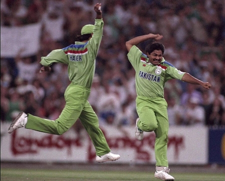 ০৬. ফাইনালে ইংল্যান্ডের Alec Stewart কে আউট করার পর পাকিস্তানের Aaqib Javed এর উল্লাস