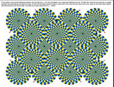 যখন আপনি স্পাইরালের (Spiral) দিকে তাকাবেন তখন মনে হবে নড়াচড়া করছে।আসলে ছবিটি স্থির। ইংরেজিতে একে "illusory movement" বলে। আপনি যখন একটি স্পাইরালের দিকে তাকাবেন তখন সেটা স্থির মনে হবে কিন্তু ওন্যগুলো সচল মনে হবে। তাছাড়ও এটা আপনার ইচ্ছার ওপর নির্ভর করে। আপনি যদি ভাবেন এটি নড়াচড়া করছে তাহলে এটি নড়াচড়া করবে,যদি ভাবেন স্থির তবে স্থির মনে হবে