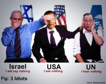 Stop Killing in Gaza’, ‘Stop Killing Children’ ইত্যাদি প্লাকার্ড হাতে বাংলাদেশ, ভারত এবং পাকিস্থানসহ বিশ্বের বিভিন্ন দেশে ভদ্রলোকী শ্লোগান দিয়ে শহরের নিরাপদ রাস্তার মোড়ে দাঁড়িয়ে হাজার হাজার মানুষ প্রতিবাদ জানিয়েছে গতকাল। কিন্তু সন্ত্রাসী ইসরাইল কি বিন্দুমাত্র তোয়াক্কা করবে ? মনেহয় না। কারন তাদের কাছে আছে আমেরিকার মত দেশের অদৃশ্য সহযোগীতা। আরো আছে জাতিসংঘের নিরবতা।