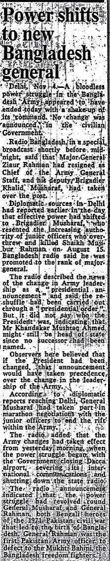 [৪] রাত ১১ টায় বাংলাদেশ রেডিও থেকে ঘোষনা করা হয় খালেদ মোশাররফ নতুন সেনা প্রধান হিসেবে জিয়াউর রহমানের স্থলাভিষিক্ত হয়েছেন.......
