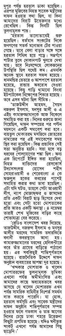 নভেম্বর সকাল সাড়ে ৮ টায় ডিআইজি ই.এ. চৌধুরীর কাছ থেকে জেলহত্যা কান্ডের ঘটনা জানতে পেরে তাকে সহ খালেদ ৪ ই বেংগল অফিসে আসেন শাফায়াত জামিলকে সেটা জানাতে.....