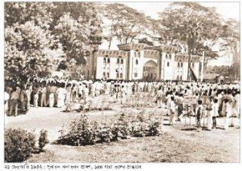 সকাল ৯টা থেকেই ঢাকা বিশ্ববিদ্যালয়ে জিমনেশিয়াম মাঠের পাশে ঢাকা মেডিকেল কলেজের( তখন ঢাকা বিশ্ববিদ্যালয়ের অন্তর্গত) গেটের পাশে ছাত্র-ছাত্রীদের ভীড় জমে উঠছে। সকাল ১১টায় “কাজী গোলাম মাহবুব, অলি আহাদ, আব্দুল মতিন, গাজীউল হক” প্রমুখের উপস্থিতিতে সমাবেশ শুরু হয়। ১৪৪ ধারা ভঙ্গের ব্যাপারে ছাত্র নেতৃবৃন্দ ও উপস্থিত রাজনৈতিক নেতৃবৃন্দের মাঝে মতের অমিল দেখা যায়। ঢাকা বিশ্ববিদ্যালয়ের চ্যান্সলর ডঃ এম,এম,হোসেইন এর নেতৃত্বে কয়েকজন শিক্ষক সমাবেশস্থলে আসেন। এবং ১৪৪ ধারা ভংগ না করার জন্য ছাত্রদের অনুরোধ জানান।