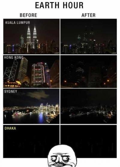 কারণ বছরের ৪মাস মানে গ্রীস্ম - বর্ষাকালে আমরা দিনে রাইতে ২৪ ঘণ্টার মধ্যে সব মিলাইয়া ২০ ঘণ্টাই Earth Hour চেলিব্রেট করি !!!