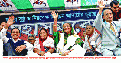 সামঙ্্রতিক সময়ে স্ট্মরণাতীতকালের বৃহত্তম এ মহাসমাবেশে সাবেক প্রধানমন্পী শেখ হাসিনা সভানেত্রীর ভাষণে বলেন, জনগণ অবাধ, নিরপেক্ষ ও সুষ্ঠু নির্বাচন চায়। নীলনকশা ও কারচুপির নির্বাচন গ্রহণযোগ্য হবে না। কিন্তু প্রধান উপদেষদ্বা সেটা হতে দেবেন না। নিরপেক্ষ নির্বাচনের জন্য উপদেষদ্বাদের প্যাকেজ প্রস্টস্নাবে ইতিবাচক সাড়া দেওয়ার কথা জানিয়ে তিনি বলেন, 'ইয়েস উদ্দিন' তার ম্যাডামের টেলিফোন ও হাওয়া ভবনের নির্দেশ পেয়ে ওই প্রস্টস্নাব বাস্টস্নবায়নের বেলায় পিছু হটলেন। ফলে পদত্যাগ করলেন চার উপদেষদ্বা। এর মানেই প্রধান উপদেষদ্বা কারচুপির নির্বাচন করতে চাইছেন।