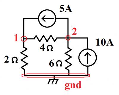 যেমন, নোড, V1, V2 থেকে কারেন্ট I3, I5 ; ২ ওহম এবং ৬ ওহম এর ভিতর দিয়ে প্রবাহিত হচ্ছে। প্রত্যেক ক্ষেত্রেই অপর নোড হল গ্রাউন্ড।