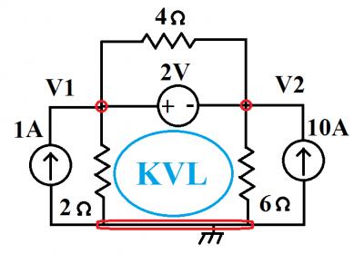 সুপারনোডের কারনে একটা কাজ বেশি করতে হবে তা হল, সুপারনোডের ভোল্টেজ সোর্সকে হিসাবে আনার জন্য একে কার্শফের ভোল্টেজ ল দিয়ে প্রকাশ করতে হবে। নিচের ছবিতে কোন লুপে কার্শফের ভোল্টেজ ল প্রয়োগ করতে হবে তা দেখান হয়েছে।