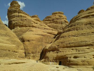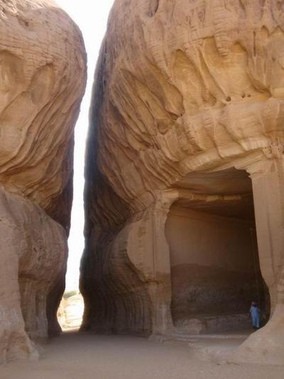 ড্রাইভার সাহেব আমাদেরকে একজায়গায় থামালেন। গম্বুজ আকৃতির কয়েকটি পাহাড় দেখা যাচ্ছে। আগের পাহাড়গুলোর মতো তেমন আকর্ষনীয় নয়। আমরা ঝটপট কিছু ছবি তুলে আবার গাড়ীতে চড়ে বসলাম। আমাদের ড্রাইভার সাহেব মনে হয় অবাকই হলেন, যারা একেক জায়গায় ১০টি ছবি তোলে, তারা এটা না দেখেই অবজ্ঞাভরে চলে যাচ্ছে? আমরাও অবাক হলাম, কি আছে এখানে? ড্রাইভার সাহেব আমাদেরকে সামনে নিয়ে গেলেন। পাহাড় ঘুরতেই আমরা বিষ্মিত। এটা না দেখেই চলে যাচ্ছিলাম? দুই পাহাড়ের মাঝখান দিয়ে পথ চলে গেছে। ঠিক যেন পেট্রার মতো। এটা ছিল এই মাদায়েন সালেহ ঢুকার প্রধান পথ।