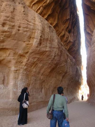 প্রাকৃতিকভাবে তৈরি হওয়া সরু এই পথ দিয়েই এক সময় কাফেলা শহরে ঢুকত। পাশেই মজলিস কক্ষ (‘আদ দিওয়ান’) বানানো আছে। এখানে বিশ্রাম নিত, পানি পান করত। ব্যবসায় বাণিজ্যের আশায় মূর্তি পূজা করত। এ এক অসাধারন সৃষ্টি। আমি বিভিন্নভাবে এই সৃষ্টিকে ক্যামেরায় ধরে রাখতে চাইলাম। আমার ভেতরে অবশ্যই উত্তেজনা কাজ করছিল। কিন্তু কোন কারন ছাড়াই তখনি বালিতে আমার পা দেবে গেল। আমি পিছলিয়ে গেলাম, আর আমার ক্যামেরাটি পাহাড়ের দেয়ালে বাড়ি খেল। এত কষ্ট জীবনে পাইনি, আমার ক্যামেরা আর কাজ করছেনা। চারপাশের এত এত সৌন্দর্য্য, কিন্তু তার ছবি তুলতে পারছিনা। আমরা সরু পথের মাঝ দিয়ে অন্য পাশে গেলাম। প্রাচীন পথটি দেখতে পেলাম।