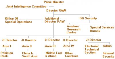 নয়াদিল্লীর লোদি রোডের সদর দফতর –আঞ্চলিক সদর দফতর-বিদেশে অবস্থিত স্টেষন অফিস-মাঠকর্মী। বিদ্দেশে অবস্থিত স্টেষন অফিস গুলি একএকজন কন্ট্রোলিং আফিসারের অধীনে যারা মাঠ পর্যায়ে অবস্থানকারী কর্মীদের অ্যাসাইন্ট প্রদান,নিয়ন্ত্রন,সুপারভিশন তথ্য সংগ্রহ ও সংরক্ষন করে থাকে। বিভিন্ন সুত্র থেকে ফিল্ড অফিসার ও সহকারী ফিল্ড অফিসাররা তথ্য সংগ্রহ করে সিনিয়ার ফিল্ড অফিসারকে দেয় সিনিয়ার ফিল্ড অফিসার বা স্টেশন অফিসার সেই প্রাপ্ত তথ্য যাচাই বাছাই করে আঞ্চলিক বা সদর দফতরের বিভিন্ন ডেস্কে প্রেরন করেন।এরপর ডেস্ক প্রধান সেই তথ্য গুরত্ব বিচারে আরো উপরে প্রেরন করেন। “র” এ কর্মীদের কে এজেন্ট হিসাবে না বলে রিসার্চ অফিসার বলা হয়। এই গোয়েন্দা সংস্থায় উল্লেখযোগ্য পরিমানে নারী অফিসার কাজ করে থাকে। বগত বছরে চীন ও পাকিস্তান ডেস্ক ভেঙ্গে আলাদা ভাবে চীনের জন্য একটি ডেস্ক করা হয়েছে।