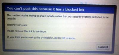আমার ওয়েব সাইটের পূর্ণাঙ্গ নাম বা কোনো লিংক ফেসবুকে পোষ্ট করতে পারছি না। পোষ্ট করতে গেলে ফেসবুক You can't post this because it has a blocked link -এই নোটিশ দেখাচ্ছে। নোটিশে আরো উল্লেখ আছে, The content you're trying to share includes a link that our security systems detected to be unsafe: opennews24.com