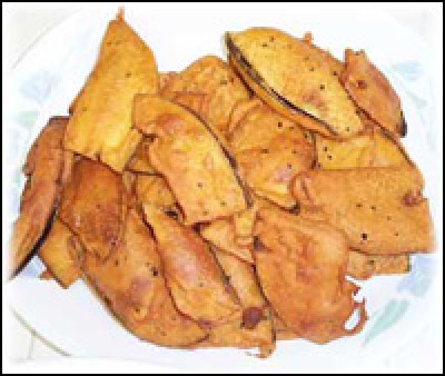 কড়াইয়ে তেল গরম করুন। বেসনের গোলায় বেগুন ডুবিয়ে তেলে ছাড়ুন। উল্টে-পাল্টে 1 মিনিট ভাজ অথবা বাদামী রং আর মচমচে করে ভারম্নন। তেল ছেঁকে কাগজের উপরে রাখুন।