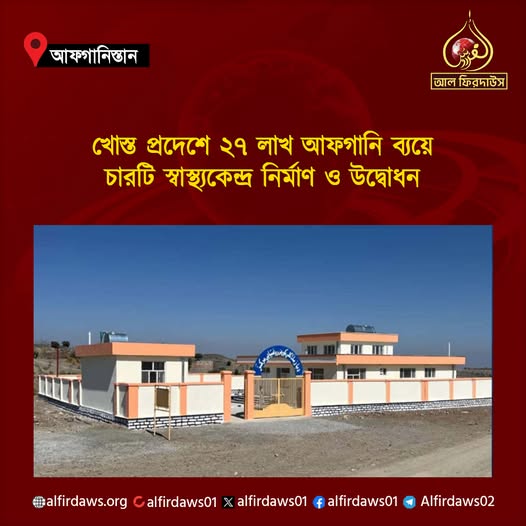 আফগানিস্তানের খোস্ত প্রদেশে প্রায় ২৭ মিলিয়ন আফগানি ব্যয়ে চারটি নতুন স্বাস্থ্যকেন্দ্র নির্মাণ সম্পন্ন করে আনুষ্ঠানিকভাবে উদ্বোধন করেছে ইমারাতে ইসলামিয়া। এসব স্বাস্থ্যকেন্দ্রগুলো চালুর মাধ্যমে সংশ্লিষ্ট এলাকার জনগণের চিকিৎসাসেবায় নতুন অধ্যায়ের সূচনা হয়েছে।