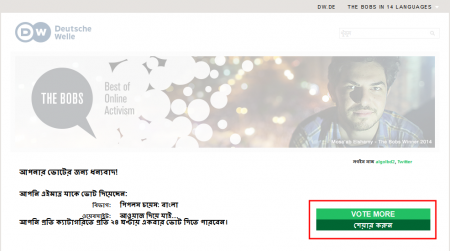 এবার ২০১৫ এর কথায় আসা যাক। মইনুল ভাইয়ের পোষ্টের মাধ্যমে ইতিমধ্যে আপনারা জেনে গেছেন ৪৮০০টি বেশী মনোনয়ন থেকে মইনুল ভাইয়ের ব্লগ আওয়াজ দিয়ে যাই মুল পর্বে জায়গা পেয়েছে। যেখানে আপনার-আমার ভোটের মাধ্যমেই একজন নির্বাচিত হবে। মইনুল ভাইয়ের লেখা নিয়ে আমার কিছু বলার দরকার আছে বলেও মনে হয় না। আপনার সবাই জানেন তার চমৎকার ব্লগিং এর কথা। সত্যিকার অর্থে ব্লগের যে মুলধারা সেই ধারা বজায় রেখেই তিনি বাংলা ব্লগে বহুদিন ধরে ব্লগিং করে আসছেন। তাই আমার আপনার ভোট তার প্রাপ্য। তাই সকলের কাছে বিনীত অনুরোধ উনাকে আপনার মুল্যবান ভোট দিন।