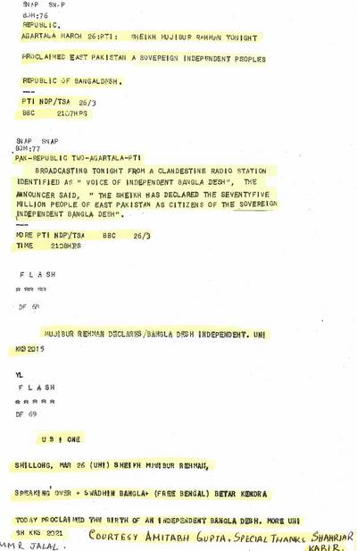 ২৬ মার্চ, ১৯৭১ মুজিবের স্বাধীনতা ঘোষনার একটি প্রমাণ : টেলেক্স প্রিন্ট আউট