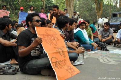সিরাজী ভবনের সামনে সংগীত ও নাট্যকলা বিভাগের ছাত্র-ছাত্রীদের অবস্থান