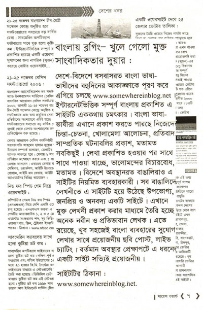 সায়েন্স ওয়াল্ডে সেপ্টেম্বর সংখ্যায় সামহোয়ার নেট সম্পর্কে ছোট একটি লেখা প্রকাশ করেছি। ইচ্ছে ছিলে সামহোয়ার সমন্ধে বড় আকারে একটি প্রতিবেদন লিখার। কিন্তু শেষ মুহূর্তে এরকম ধারণা আসায়, আমাদের পত্রিকায় স্থান সংকুলান না হওয়ার কারণে সেটা বড় আকারে প্রকাশ করা সম্ভব হয়নি। তবে আশা রাখি পরবর্তীতে সায়েন্স ওয়াল্ডে, আমাদের সবার প্রিয় সামহোয়ারব্লগনেট সম্পর্কে বড় আকারে প্রতিবেদন প্রকাশ করতে পারবো।