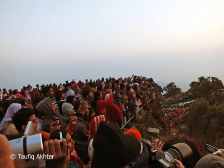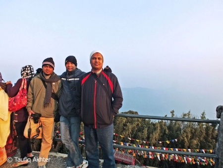 দার্জিলিং সম্পর্কে যাদের ধারনা কম তাদের সুবিধার্থে বলে নেয়া ভালো - দার্জিলিংয়ে এসে সবাই টাইগার হিল নামক পাহাড়ে সূর্যোদয় দেখতে যায়। ২ এপ্রিল, ২০১৩ তারিখ ভোর ৪টায় ড্রাইভার হোটেলে এসে উপস্থিত। আমরা চারজন তাড়াহুড়া করে তৈরী হয়ে নিলাম। প্রচন্ড ঠান্ডা লাগছিলো। সবাই ৪টা ৫টি জামা পড়ে তৈরী হয়ে গেলাম। মাথায় টুপি ও হ্যান্ড গ্লাবস্ পরে মোটামুটি মেরু অভিযাত্রী মার্কা লুক হয়ে গেলো আমাদের। মজাই লাগছিলো এই মহা শীতকে জয় করতে পেরে। ড্রাইভার গাড়ী ছাড়লো ৪.১৫ মিনিটে। আমাদের জিপটি ছিলো একটি নতুন মাহিন্দ্রা বোলেরো জিপ। বেশ শক্তপোক্ত ভারতীয় গাড়ি। ড্রাইভারের নাম ভুলে গেছি। বয়স ৭০। গত ৫০ বছর ধরে গাড়ি চালাচ্ছেন দার্জিলিং এলাকায়। ড্রাইভারের বয়স শুনে আমাদের মিশ্র প্রতিক্রিয়া হলো। নিজেরা হাসাহাসি করলাম এই বলে যে এই লোক নিয়ে দার্জিলিংয়ে রাস্তা ভুল করার চান্স কম, আর উল্টাপাল্টা বা জোড়ে গাড়ি চালানোর সম্ভাবনা নাই বললেই চলে। কিন্তু গাড়ি চালানোর সময় বার্ধক্য জনিত মৃত্যুর জোরালো সম্ভাবনাও (আশংকা) আছে। আমি মনে মনে হাসছিলাম এই ভেবে যে, বিটিভির নাটকে নায়কের ৭০ বছরের বাবারা বিছানায় চিৎ হয়ে শুয়ে দামি দামি অষুধ ও আঙুর আপেলের শ্রাদ্ধ করতে করতে কিভাবে পারিবারিক অভাব ও গন্ডগোল বাড়িয়ে তোলে আর সেখানে এই পাহাড়ী গোর্খারা ৭০ বছর বয়সেও অবলীলায় গাড়ি চালিয়ে জীবিকা নির্বাহ করে যাচ্ছে। ড্রাইভারের সাথে বিভিন্ন বিষয়ে গল্প করতে করতে ভদ্রলোককে আমাদের বেশ ভালো লেগে গেলো। টাইগার হিল যাওয়ার পথে আবার ঘুম ষ্টেশন পড়লো। ঘুম পার হওয়ার পড় গাড়ি চড়াই পথে উপরের দিকে উঠতে লাগলো। বাহিরে তখনও রাত। লাইন ধরে অনেক গাড়িই তখন আমাদের আগে পিছে টাইগার হিলের দিকে যাচ্ছিলো। দার্জিলিং শহরের ভিতরে থাকতেই আমাদের ড্রাইভার গাড়ি থামিয়ে একজন লোককে তুলে নিলো লিফট্ দেবার জন্য। আরও অনেক মানুষকেই দেখলাম রাস্তায় দাড়িয়ে গাড়ি দেখলে হাত উঁচু করে লিফট্ চাচ্ছে। বুঝলাম এটা এখানের অলিখিত নিয়ম। গাড়ি খালি থাকলে মানুষককে লিফট্ দেয়া। এই গভীর রাতেও দেখলাম সুশ্রী অনেক তরুরী বা মধ্য বয়সি মেয়েরা রাস্তায় একলা দাড়িয়ে গাড়ি দেখলে হাত উচিয়ে লিফট্ চাচ্ছে। সবার হাতেই একটি করে ফাক্স। আমাদের গাড়িতেও এমন একটি মেয়ে উঠলো। টাইগার হিলে পৌছানোর পর সেই তরুণী আমাদেরকে বললো আমার সাথে আসুন আপনাদের ভালো জায়গায় দাড় করিয়ে দিবো। আমরা মেয়েটির সাথে রওনা দিলে সে আমাদের নিয়ে টাইগার হিলের অবজারভেশন টাওয়ারের পূর্ব পাশের রেলিংয়ে খালি যায়গা দেখে দাড় করিয়ে সাথের ফাক্স থেকে চার কাপ কফি সবার হাতে ধরিয়ে বললো ”চাল্লিশ রূপিয়া দিজিয়ে সাব”। বুঝলাম এটাই ওদের ব্যবসা। কিন্তু ভালো লাগ