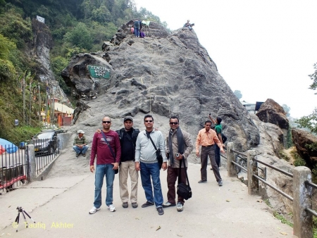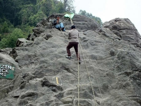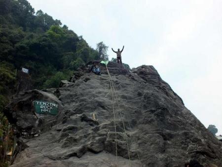 ‘হিমালয়ান মাউন্টেনিয়ারিং ইনস্টিটিউট’ থেকে বেড় হয়ে আরেকটু সামনে যেতেই পড়ে ‘তেনজিং রক’। তেনজিং রক একটি বিশাল পাথর যেটা দেখতে বিরাট পর্বতের একটি ছোট মডেলের মতো। এখানে হিমালয়ান মাউন্টেনিয়ারিং ইনস্টিটিউটের ছাত্রদের প্রশিক্ষণ দেয়া হয়। এছাড়াও পর্যটকদের জন্য স্বল্প উচ্চতার পর্বতারোহন অভিজ্ঞতা হয়ে যায় এখানে। আমরা তেনজিং রকে পৌছালাম তখন ট্যুরিষ্টদের বেশ ভির। ২০ রুপি দিয়ে ভিতরে ঢুকে তেনজিং রকে আরোহন করা যায়। পুরো পাথরটিই একটি পর্বতশৃঙ্গের আকারে বিরাজমান। পাথরের উপরে একজন দড়ি নিয়ে বসে আছে। নিচে একজন ট্যুরিষ্টদের কোমরে দড়ি বাধতে সাহায্য করছে, সাথে সাথে বুঝিয়ে দিচ্ছে কিভাবে পাথরের উপরে উঠতে হবে। আমাদের ৪ জনের মধ্যে আমিই টিকেট কেটে প্রবেশ করি এবং কোমরে দড়ি বেশে কয়েক সেকেন্ডে পাথরের উপরে উঠে যাই। উপরে উঠার পর পর্বত সামিট করা বা পর্বত বিজয়ের মজার কিছুটা পাই। নিচে বাকি তিনজন বেশ হইচই করে উৎসাহ দেয়। মোটের উপর ভালোই লাগে যায়গাটা।
