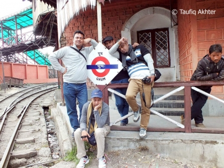 যাইহোক, ঘুমে পৌছে আমাদের মন বেশ খারাপ হয়ে গেল। কল্পনায় দেখা টয় ট্রেন ষ্টেশনটিকে বেশ নোংরা ও মলিন মনে হলো। আমরা গাড়িতে ব্যাগ বোচকা রেখে গাড়ির নাম্বার প্লেটের ছবি তুলে (ব্যাগ নিয়ে পালিয়ে গেলেও যাতে ড্রাইভারকে ধরতে পারি) রেল ষ্টেশনের চারিদিকে ফটোসেশন করতে লাগলাম। ড্রাইভারের হাতে ক্যামেরা দিয়ে ’ঘুম’ লেখা সাইনবোর্ডের সামনে ঘুমানোর ভঙ্গিতে ছবি তোলার চেষ্টা করলাম বেশ কবার। কিন্তু জুয়েল বার বার হেসে ফেলায় পারফেক্ট ছবি হচ্ছিলো না। ঘুম রেল ষ্টেশনে আমরা প্রচুর বিদেশী পর্যটককে ঘোরাফেরা করতে দেখলাম। সম্ভবত, ইউনেস্কোর বিশ্ব ঐতিহ্য হওয়াতে বিদেশীদের আগ্রহ কিছুটা বেশী। রেল ষ্টেশনের ছবি তুলতে তুলতেই ইঞ্জিনসহ ট্রেন চলে আসলো। ইঞ্জিনসহ ট্রেনের ছবি তোলা হলো বেশ কয়েকটা। আমাদের গ্রুপ ছবিও তুললাম বেশ কিছু। ভালো কথা ঘুমের উচ্চতা সমুদ্র পৃষ্ঠ থেকে ৭৪০০ ফিট উপরে। আগেই বলেছি একসময় পৃথিবীর উচ্চতম রেল ষ্টেশন ছিলো এটি। আমাদের ফটোসেশনের ফাঁকে ড্রাইভার মনে করিয়ে দিলো তাকে দিনে দিনে দার্জিলিং থেকে মানেভঞ্জন ফিরতে হবে। এছাড়া সবার বেশ ক্ষিদে পেয়ে গেছিলো। তবে আমরা সিদ্ধান্ত নিলাম একবারে দার্জিলিংয়ে গিয়ে দ্বিতীয় বারের মতো লাঞ্চ করবো। দ্বিতীয় বারের মতো বললাম কারন আমরা মানেভঞ্জন থেকে লাঞ্চ করে এসেছিলাম। ড্রাইভার জিজ্ঞেস করছিলো আমরা ’ঘুম মনাষ্ট্রি’ দেখবো কিনা? মনাষ্ট্রি মানে বুদ্ধদের উপাসনালয়। ঘুমের মনাষ্ট্রিটি বেশ বিখ্যাত। কিন্তু দার্জিলিংয়ের এতো কাছে এসে আমাদের আর তর সইছিলো না। কখন দার্জিলিং পৌছাবো এটাই মনের মধ্যে আকুপাকু করছিলো। ড্রাইভারকে সবাই একত্রে বললাম ’দরকার নাই আপনি দার্জিলিংয়ে চলেন আগে’।