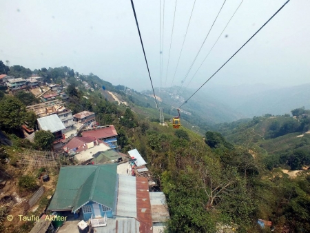 ছবিটবি তুলে আবার যাত্রা শুরু করি কেবল কার ষ্টেশনের দিকে। দার্জিলিং ক্যাবলকার সার্ভিসটি দার্জিলিং রোপওয়ে বা দার্জিলিং দড়িপথ নামে পরিচিত। রোপওয়ের বঙ্গানুবাদ বোধহয় আমিই প্রথম করলাম। হাঃহাঃহাঃ। যাকগে, রোপওয়ে ষ্টেশনের পাশেই দার্জিলিংয়ের বিখ্যাত স্কুল সেন্ট জোসেফ অবস্থিত। বাহির থেকে স্কুল বিল্ডিংটি দেখতে বেশ সুন্দর। ছাত্র হিসেবে কোনকালেই খুব ভালো ছিলাম না ফলে স্কুল কলেজ নিয়ে উচ্ছাস দেখালাম না। ড্রাইভার জিজ্ঞাসা করেছিলো যে আমরা স্কুলটি দেখতে চাই কিনা। আমরা বললাম, দরকার নাই। ক্যাবলকারটা ভালো ভাবে দেখতে চাই। আমাদের নামিয়ে দিয়ে ড্রাইভার তার বাসায় চলে গেল দুপুরের খাবার খেতে। যাওয়ার আগে বললো আপনাদের ফিরে আসতে ১ ঘন্টা লাগবে, এর মধ্যে আমি দুপুরের খাবারটা খেয়ে আসি। ফিরে এসে আগের জায়গায় আমাকে পাবেন। যাক আমরা সিঁড়ি বেয়ে ক্যাবলকারের ল্যান্ডিং ষ্টেশনে উঠে আসলাম। একের পর এক ক্যাবল কার এর বাক্স সদৃশ খোপ গুলো তারের সাথে ঝুলতে ঝুলতে আসছে এবং মানুষ নামিয়ে এবং নতুন মানুষ পেটে নিয়ে আবার তারের সাথে ঝুলতে ঝুলতে নিচের দিকে চলে যাচ্ছে। দেখেই আমাদের বেশ রোমাঞ্চ হচ্ছিলো। আমার ক্যাবলকারের অতীত অভিজ্ঞতা বেশ ভারিই বলতে হবে। মালোশিয়া, সিঙ্গাপুর ও কোলকাতার সাইন্সসিটিতে ক্যাবলকারে চরেছি। কোনটাতেই খুব বেশি ভয় পায়নি। কিন্তু দার্জিলিংয়ের ক্যাবলকারে কেন যেন অনেক ভয় লাগছিলো। ক্যাবলকারের বাক্সগুলোকে কেমন যেন ধোরে বেন্ধে থামানো হচ্ছিলো। দেখেই আমরা একটু ভয় পেয়ে যাচ্ছিলাম। যাক, ৪ জন মিলে যখন বাক্সের মধ্যে উঠে পরলাম, তখন মজা হলো। আমি ও লিটন মহা আনন্দে ছবি তুলতে লাগলাম জানালা দিয়ে ক্যামেরা বাহির করে। নিচে পুরোটা দৃশ্য জুড়ে ছিলো চা বাগান আর আকাশ ছোয়া পর্বতের সারি। আসলেই অসাধারন দৃশ্য। আমান বলছিলো ওর বউ নাকি এখানে ইউনিভার্সিটির ট্যুরে এসে ভয়ের চোটে মেঝেতে বসেছিলো। প্রাথমিক উত্তেজনার পর আমাদের অবস্থাও কিছুটা ঐরকম হয়ে গেলো। এই ক্যাবলকার সার্ভিটটি ৭০০০ ফুট উচ্চতায় শুরু হয়ে ৬২০০ ফুট উচ্চতায় নেমে আসে। বেশ অনেকটা পথ পাড়ি দিতে হয়। আমাদের পাশে দিয়ে যখন অন্যদের ক্যাবলকারগুলো পাসকেটে যাচ্ছিলো বেশ মজা লাগছিলো দেখে। তবে এখানকার ক্যাবলকারগুলো বেশ হালকা দেখতে, তাই খুব ভয় লাগছিলো। মাঝামাঝি যেয়ে কারটি থেমে গেলে আমাদের ভয় তখন চুড়ান্ত পর্যায়ে। নিজেরা আলাপ করছিলাম এখান থেকে লাফ দিলে বাঁচার সম্ভাবনা কত পার্সেন্ট। ভিতরে ভয় থাকলেও হাসাহাসি চলছিলো একই সাথে। আমরা ঠিক করলাম ফেরার পথে ক্যাবল কারে ফিরবো না। পারলে ওখান থেকে গাড়ি করে ফিরবো। এমন ভয়াবহ অভিজ্ঞতা হবে জানলে এই পথে পা বাড়াতাম না।