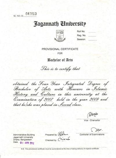 সিঙ্গাপুরের একটি বেসরকারি প্রতিষ্ঠানে এক্সিকিউটিভ পদে কর্মরত এ ইসলাম। প্রতিষ্ঠানটিতে জমা দেওয়া সার্টিফিকেটে লেখা আছে, তিনি জগন্নাথ কলেজ থেকে ১৯৭৯ সালে বিকম ও ১৯৮১ সালে এমকম পাস করেন। স¤প্রতি ওই প্রতিষ্ঠানটির এক আবেদনের পরিপ্রেক্ষিতে প্রমাণিত হয়েছে তার সার্টিফিকেট ভুয়া। গুরুদাস চন্দ্র হালদার নামের একজন নিউইয়র্ক সিটি ইউনিভার্সিটিতে আবেদন করেছিলেন। যাচাই করে দেখা গেছে সার্টিফিকেটটি ভুয়া।