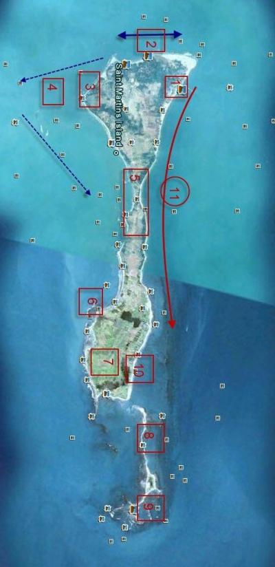 অবশ্যই দ্বীপের এই *11(লাল তির চিহ্নিত) সাইটে পানিতে নামবেন না । এই দিকে ঢাল নেই । অবশ্য কেউ যদি Suicide করতে চায় তা হলে ভিন্ন কথা। নিচের ছবিটা আবার দেখুন।