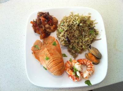 সন্ধ্যায় ডিনার বানালাম তিনজনের জন্য সকালে কেনা স্মাসল্স এজ সার্টার, স্ক্ালপ স্যালাড,প্রন, অস্টে্রলিয়ান বাগ আর হয়াইট ব্যইট দিয়ে।