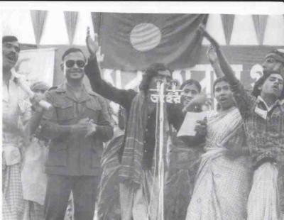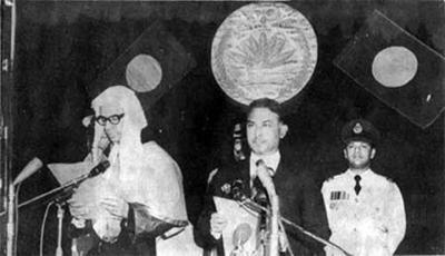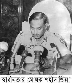 This is Swadhin Bangla Betar Kendra. I, Major Ziaur Rahman, at the direction of Bangobondhu Mujibur Rahman, hereby declare that Independent People's Republic of Bangladesh has been established. At his direction , I have taken the command as the temporary Head of the Republic. In the name of Sheikh Mujibur Rahman, I call upon all Bengalees to rise against the attack by the West Pakistani Army. We shall fight to the last to free our motherland. Victory is, by the Grace of Allah, ours. Joy Bangla.