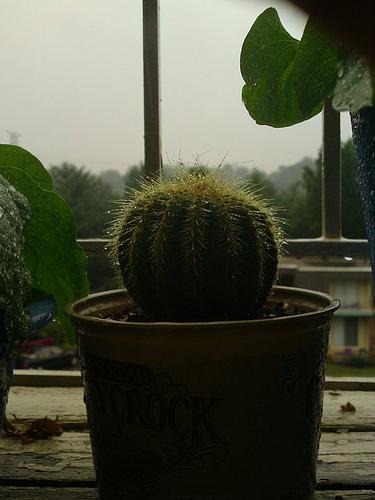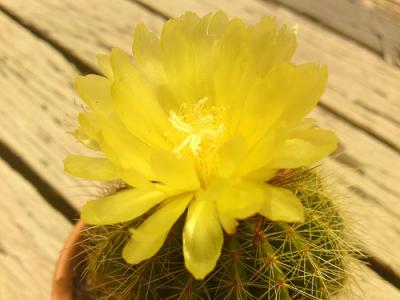 গোল্ডেন বল ক্যাকটাস। এইটার বাংলা নাম আছে নাকি জানিনা। গুতুমগাতুম চেহারার একটা সবুজ বল, গায়ে ঘন করে হলুদ রঙের কাঁটা, রোদ পড়লে সোনালী আভা ছড়ায়। জায়গা পেলে ৪/৫ ইঞ্চি পর্যন্ত ডায়া হয়, লম্বায় ২ফিট পর্যন্তও বাড়ে, পানি এক সপ্তাহে একবার দিলেই হয়। সুখী একটা ক্যাকটাস প্রায়ই মাথায় দুইতিনটা উজ্জ্বল হলুদ রঙের ফুল ফুটিয়ে হাসতে থাকে।