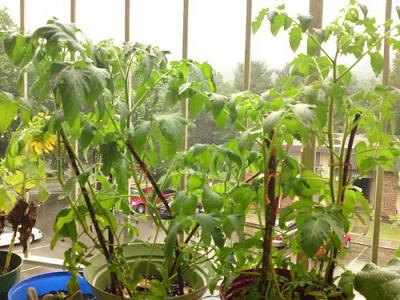 টমেটো গাছ দেশে থাকতে যা দেখতাম, তার তুলনায় এইখানে বিশাল বড় হয়। এক বিকালে এক দোকান থেকে মৃতপ্রায় ৮টা পিচ্চি চারা ফেলে দেওয়ার সময় কুড়িয়ে নিয়ে আসলাম। বড় দুইটা টবে ফ্রেশ পটিং মিক্স (সার মিশানো মাটি) ভরে ৪টা করে লাগালাম। এখন বড় হয়ে কোমরসমান হয়েছে। পানি দেওয়ার সময় পাতাগুলা ভিজে খুব সুন্দর একটা গন্ধ ছাড়ে। বেশ দেরী করে লাগিয়েছি বলে এখনও কলি আসে নাই।