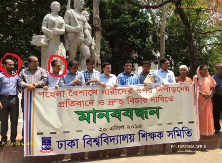 পহেলা বৈশাখে টিএসসিতে নারীদের উপর যৌন সহিংসতার প্রতিবাদে ২০ এপ্রিল, সকাল ১১ টায়, অপরাজেয় বাংলার পাদদেশে প্রতিবাদী মানব বন্ধন কর্মসূচী পালন করে ঢাকা বিশ্ববিদ্যালয়ের শিক্ষক সমিতি। খুব ভালো কথা। শিক্ষক সমিতির সভাপতি জনাব ফরিদ উদ্দীন যৌন নিপীড়নের প্রতিবাদ করতে এসেছেন তার বিশ্ববিদ্যালয়ের ছাত্রী নিপীড়নের অভিযোগে অভিযুক্ত দু'জন শিক্ষককে সাথে নিয়ে। ব্যানার ধরেছেন তারা। কী চমতকার আমাদের সহনশীলতার মাত্রা!