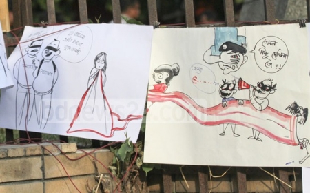বর্ষবরণে যৌন নিপীড়নের প্রতিবাদে টি এস সি তে তরুণ শিল্পী ও কার্টুনিস্ট দের প্রতিবাদ .....