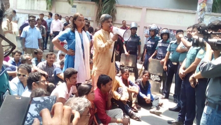 ১ লা বৈশাখ ঢাকা বিশ্ববিদ্যালয়ে নারী নিপীড়নের প্রতিবাদে ঢাকা মেট্রোপলিটান পুলিশ কমিশনারের কার্যালয়ে অবস্থান কর্মসুচিতে বক্তব্য রাখছেন ঢাকা দক্ষিন সিটি করপোরেশন নির্বাচনে সিপিবি-বাসদ সমর্থিত মেয়র প্রার্থী বজলুর রশীদ ফিরোজ।