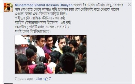 "চারিদিকে একটি ছবি নিয়ে কত যে বিভ্রান্তি শুরু হয়েছে। ঢাবির টিএসসিতে কয়েকজন নারীকে শ্লীলতাহানীর ঘটনার সাথে জবির ছাত্রলীগ কর্মী গণধোলাইয়ের ঘটনাকে কতিপয় গণমাধ্যম এক করে একাকার করে ফেলেছে।