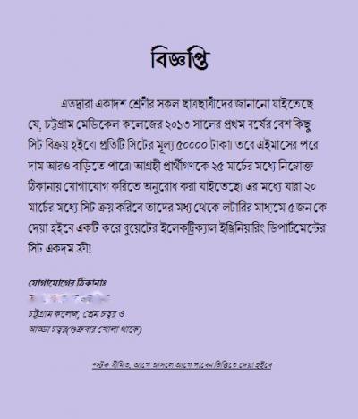 মেডিক্যালের সিট বিক্রয়, সাথে নাকি বুয়েটের সিটও ফ্রী পাইবার চান্স!(ফেসবুকে পাইছি, ব্যাপুক বিনুদুন)