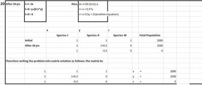 20. The species of squirrels have been introduced to an island, with a total initial population of 2000. After 10 years species I has doubled its population and species II has increased by 50%. Species III becomes extinct. if the population increased in species I equals the increase in species II and if the total population has increased by 500 determine the initial population of the three species. [ Hint Using all the information in the problem, write as a system Ax=b, where x is the vector of initial populations]