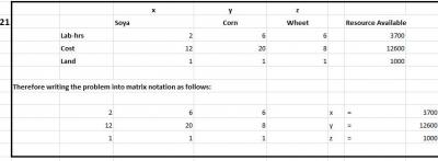 21. The Robinson farm in Illinois has 1000 acres to be planted with soybeans, corn, and wheat. During the planting season, there are 3700 labor - hours of planting time available to Mrs. Robinson. Each acre of soybeans requires 2 labors -hours, each acre of corn requires 6 labor hours. Seed to plant an acre of soybeans costs $12, seed for an acre of corn costs $20 and seed for an acre of wheat costs $8 . Mrs. Robinson has $12600 on hand to pay for seed. How should the 1000 acres be planted is order to use all the available land, labor, and seed money?
