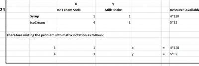 24. An ice-cream shop sales only ice-cream sodas and milk shakes. It puts 1oz of syrup and 4 oz of ice-cream in an ice-cream soda. And 1oz of syrup and 3 0z of ice cream in an milkshake. If the store used 4 gal of ice-cream and 5qt of syrup in one given day, How many ice-cream sodas and how many milk shakes did it sale on that day. (Hintz- 1 qt =32oz, 1gal= 128oz)