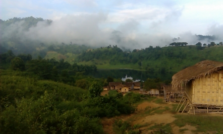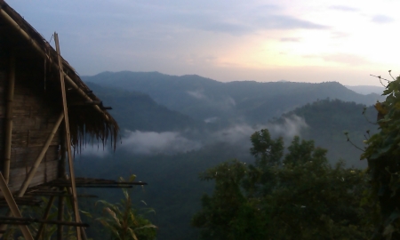 আমাদের ইচ্ছা ছিল ভোরে ঘরের মালিক আসার আগেই বের হয়ে যাব। আমরা বের হওয়ার প্রস্তুতি নিতেই হাজির হল ঘরের মালিক। আমরা বৃষ্টিতে আশ্রয় নিয়েছি দেখে কিছু বলল না। আমাদের কেনা শুটকি দিয়ে দিলাম তাকে উপহার স্বরুপ। ঘর থেকে বের হতেই আর একটা বার মুগ্ধ হলাম চারিদিক দেখে। জুমঘর যে পাহাড়ের ঢালে আছে, সেই ঢালের নিচের খাদ মেঘ দিয়ে ঢাকা ছিল। ২টি ছবি দিচ্ছি আমার সেই স্বপ্নের জুমঘরের।