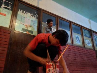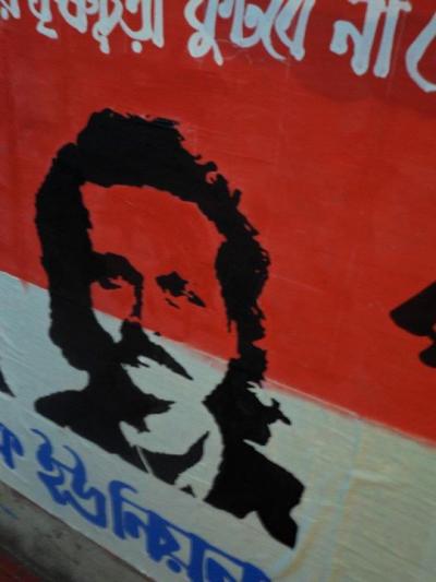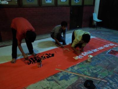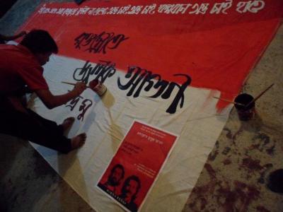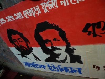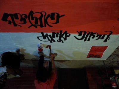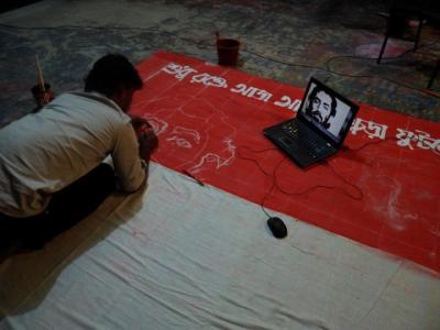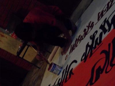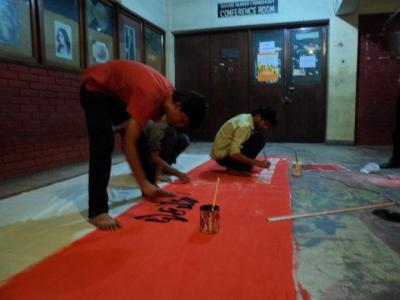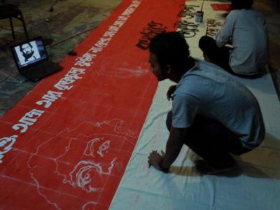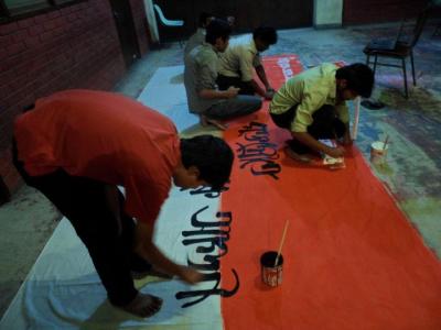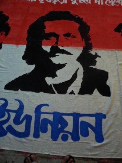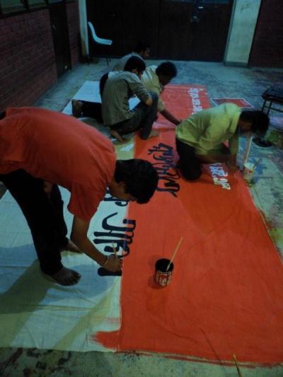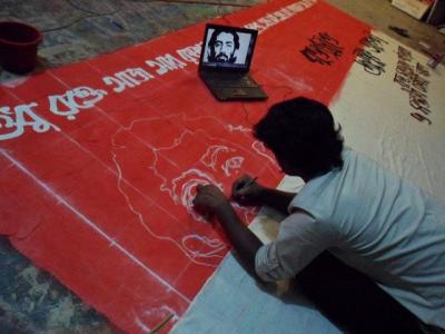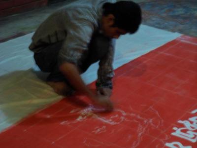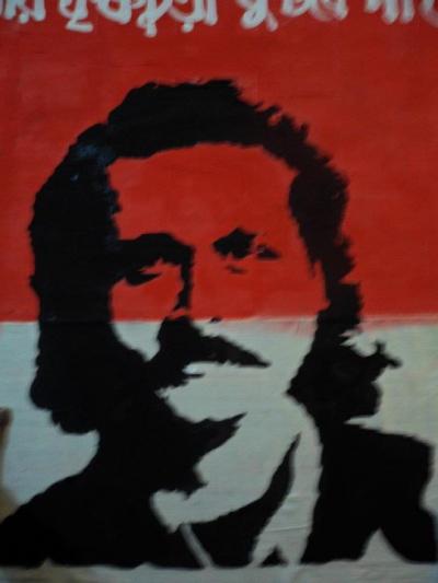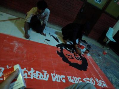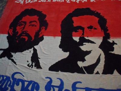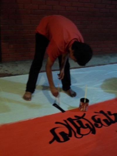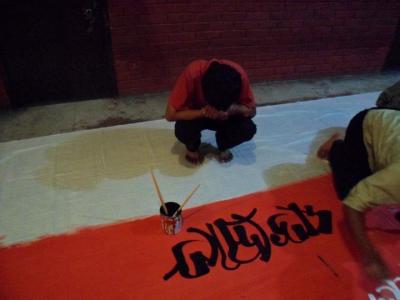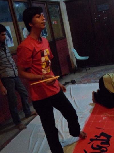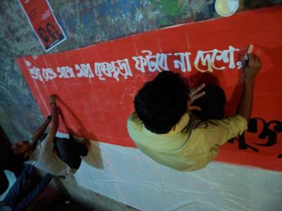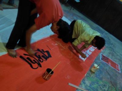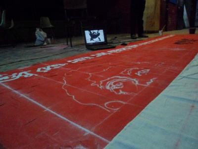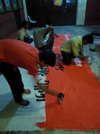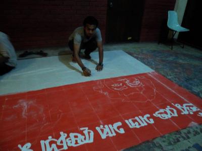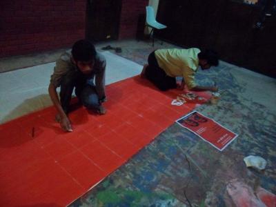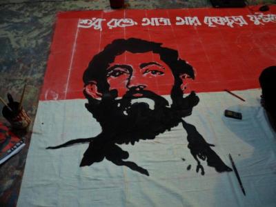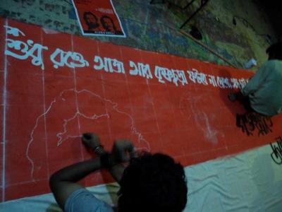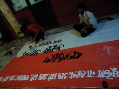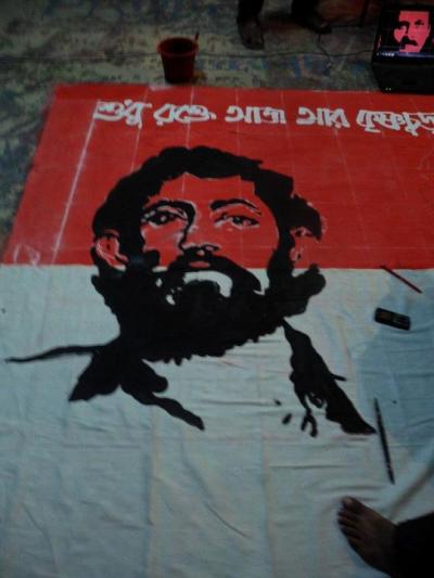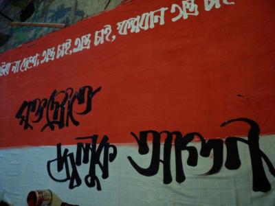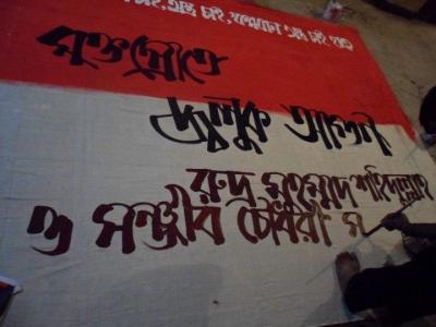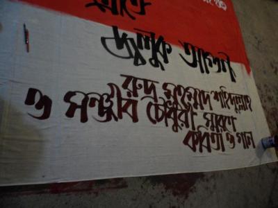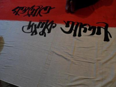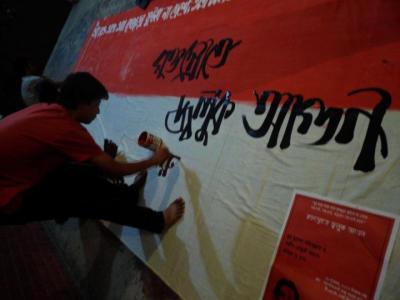 এসে দেখলাম সঞ্জীবদাকেও আঁকার কাজ প্রায় শেষ।তখন একটু ঘুমাইলাম।চেয়ারে বসে।কিছুক্ষণ পরেই হঠাত শব্দ পেয়ে ঘুম ভাংলো।দেখলাম পুরো ব্যানারটাই আঁকা শেষ।সারা রাতে যা কাজ হইছে শেষ একঘন্টায় সুমন'দা প্রায় ততটুকু শেষ করছেন।সঞ্জীব'দাকে আঁকার কাজটা ছিলো অনেক কঠিন।