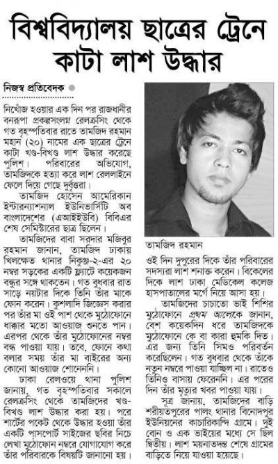 বিঃদ্রঃ ফেসবুকে গত ৫ই মার্চ নোটটা লিখেছিলাম।আজ খুব মহান কে মনে হচ্ছে।খুব।তাই এখানেও শেয়ার করলাম।গত ২রা মার্চ,২০১১ তারিখে মহানকে নৃশংসভাবে খুন করা হয় কাকলীতে।পোস্টমর্টেম রিপোর্ট থেকে পাওয়া যায়,প্রথমে ওকে ঝুলিয়ে ধাতব কিছু দিয়ে পিটিয়ে থেতলে দেয়া হয়েছে।এরপরে পিটিয়ে মাথার খুলি ভাঙ্গা হয়েছে।তারপর ওর মৃতদেহ রেল লাইনের উপরে টেনে নিয়ে যাওয়া হয়।এবং পরে রেলে কাটা পড়ে ওর দুই পা।৪মার্চ রাত ৩টায় আমি খবর পাই ঢাকা মেডিকেলের মর্গে অজ্ঞাত্নামা একজনের লাশ পড়ে আছে।তখনই ছুটে যাই ঢাকা মেডিকেল এ।পরে লাশ শনাক্ত করি।ও ৩দিন নিখোজ ছিলো।