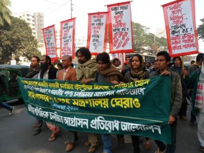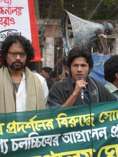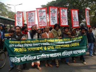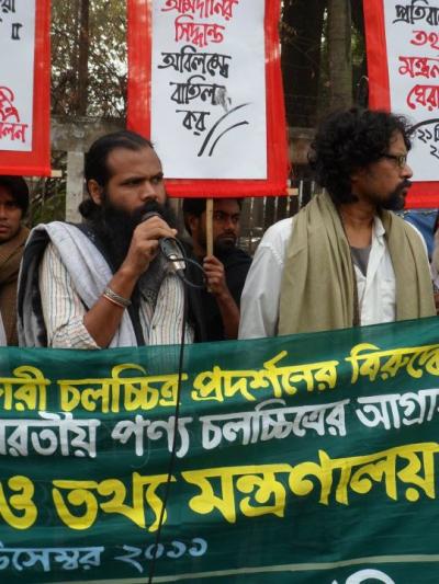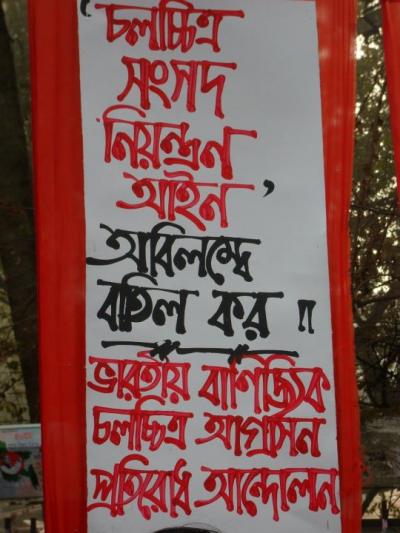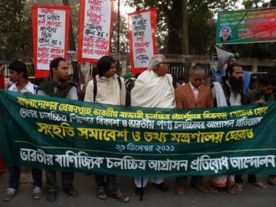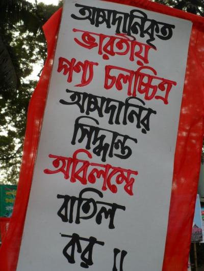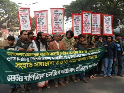 আজ ২১ ডিসেম্বর জাতীয় প্রেসক্লাবের সামনে সিনেমা হলে বাণিজ্যিকভিত্তিতে ভারতীয় চলচ্চিত্র প্রদর্শনের প্রতিবাদে ভারতীয় বাণিজ্যিক চলচ্চিত্র আগ্রাসন প্রতিরোধ আন্দোলন এর উদ্যোগে সংহতি সমাবেশ এবং তথ্য ও সংস্কৃতি মন্ত্রণালয় ঘেরাও কর্মসূচি পালিত হয়। সমাবেশে বক্তব্য রাখেন বাংলাদেশ কমিউনিস্ট পার্টির সভাপতি মঞ্জুরুল আহসান খান, দেশপ্রেমিক জনগনের মঞ্চের আহ্বায়ক ম. ইনামুল হক, গণসংহতি আন্দোলনের কেন্দ্রীয় পরিচালনা কমিটির সদস্য আবুল হাসান রুবেল, সংগীত শিল্পী অরূপ রাহী, চলচ্চিত্রকার মঞ্জুরুল হক পান্না। সমাবেশে জানানো হয় অধ্যাপক আনু মুহাম্মদ, বাংলাদেশ চলচ্চিত্র পরিচালক সমিতির সভাপতি মোহাম্মদ হান্নান, বাংলাদেশ চলচ্চিত্র শিল্পী সমিতির সভাপতি শাকিব খান, লেখক, সমুদ্র আইন বিশেষজ্ঞ নূর মোহাম্মদ, নৃবিজ্ঞানী রেহনুমা আহমেদ, ঢাকা বিশ্ববিদ্যালয়ের আন্তর্জাতিক বিভাগের অধ্যাপক আকমল হোসেন, জ্বালানী বিশেষজ্ঞ বি.ডি. রহমতুল্লাহ প্রমুখ এই আন্দোলনে সংহতি জানিয়েছেন। এছাড়া সংহতি জানিয়ে উপস্থিত ছিলেন প্রাবন্ধিক, রাজনীতিক ফিরোজ আহমেদ, প্রকৌশলী কল্লোল মোস্তফা, চলচ্চিত্রকার হাসান জাফরুল, ছাত্রফ্রন্টের রাহাত আহমেদ, ব্লগার মাহবুব রশিদ, চলচ্চিত্র কর্মী নাজমুন নাকিব, চলচ্চিত্র কর্মী হাবিবুর রহমান। সমাবেশে উপস্থিত থেকে সংহতি জানিয়েছে- গণসংহতি আন্দোলন, স্টামফোর্ড ফিল্ম স্টুডেন্ট সিনে ফোরাম, বাংলাদেশ ছাত্র ফেডারেশন, বাংলাদেশ ছাত্র ইউনিয়ন, বিপ্লবী ছাত্র মৈত্রী, সমাজতান্ত্রিক ছাত্র ফ্রন্ট, জাতীয় গণতান্ত্রিক গণমোর্চা, ছবির লড়াই, সমগীত সংস্কৃতি প্রাঙ্গন, সংস্কৃতি মঞ্চ, গানের দল লীলা, তরুনদের সংগঠন স্পর্ধা , সংস্কৃতির নয়া সেতু, জাগরণের পাঠশালা, সৃষ্টিগড় প্রভৃতি।