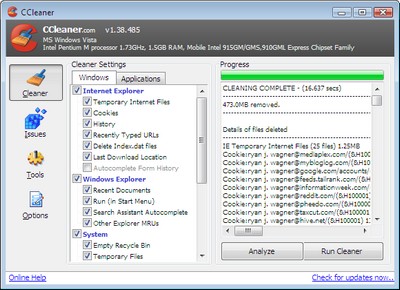 ( মাএ ৩.১৪ মেগাবাইট) দিয়ে এ অস্থায়ী ফাইল গুলো মুছে ফেলতে পারবেন। এটি দিয়ে আপনি শুধু অস্থায়ী ফাইল না আপনি এটি দিয়ে মজিলা ফায়ারফক্স ৩য় পক্ষের এ্যাপ্লিকেশন, টুলবার, সিস্টেম, ইন্টারনেট এক্সপ্লোরার, মাল্টিমিডিয়া ইত্যাদি পরিষ্কার করতে পারবেন। এটি মাধ্যেমে আপনি রেজিস্ট্রি স্কান ও সফটওয়্যার আনইনস্টল বা স্টার্টআপ নিয়ন্তন করতে পারবেন। সি ক্লিনার এর ২.২৩ সস্কারন টি এখনি বিনামূল্যে ডাউনলোড করুন।